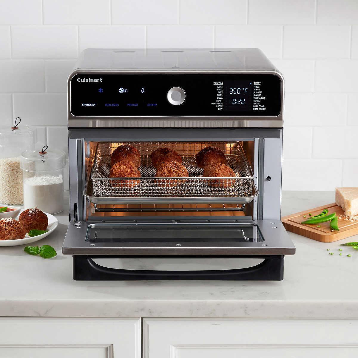 - Capacité de 0,6 pi3 : faites frire à l'air libre jusqu'à 1,4 kg (3 lb), faites griller 6 moitiés de baguels, faites rôtir un poulet de 1,8 kg (4 lb) ou faites cuire une pizza de 30,5 cm (12 po)